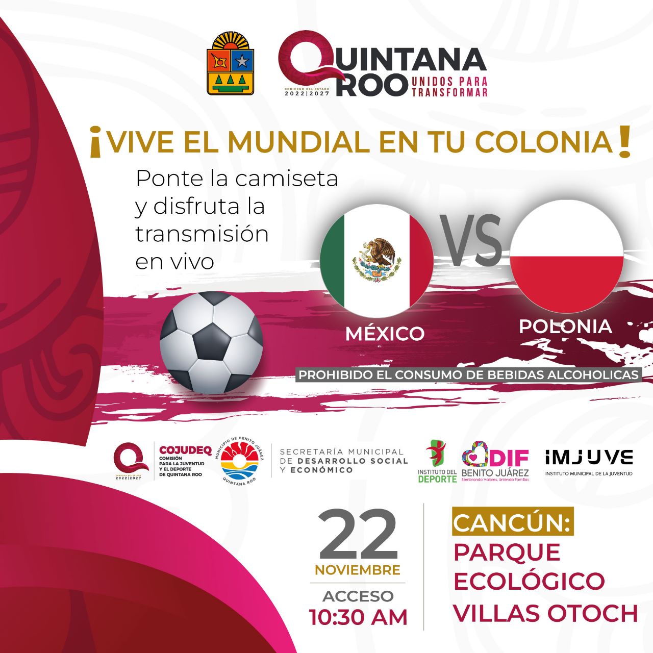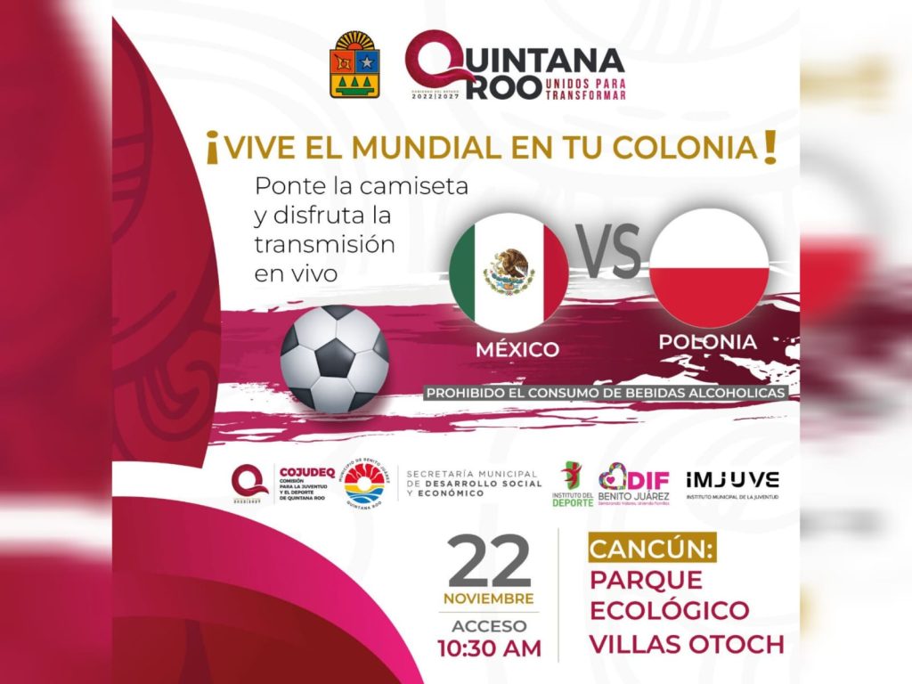 De acuerdo con Eric Arcila Arjona, presidente de la COJUDEQ explicó que con ¡Vive el Mundial en tu colonia! los días martes 22, sábado 26 y miércoles 30 de noviembre se colocarán pantallas en el los parques Hábitat III en Chetumal y el Ecológico Villas Otoch en Cancún para que todas y todos se pongan la camiseta y acudan a apoyar al equipo nacional.