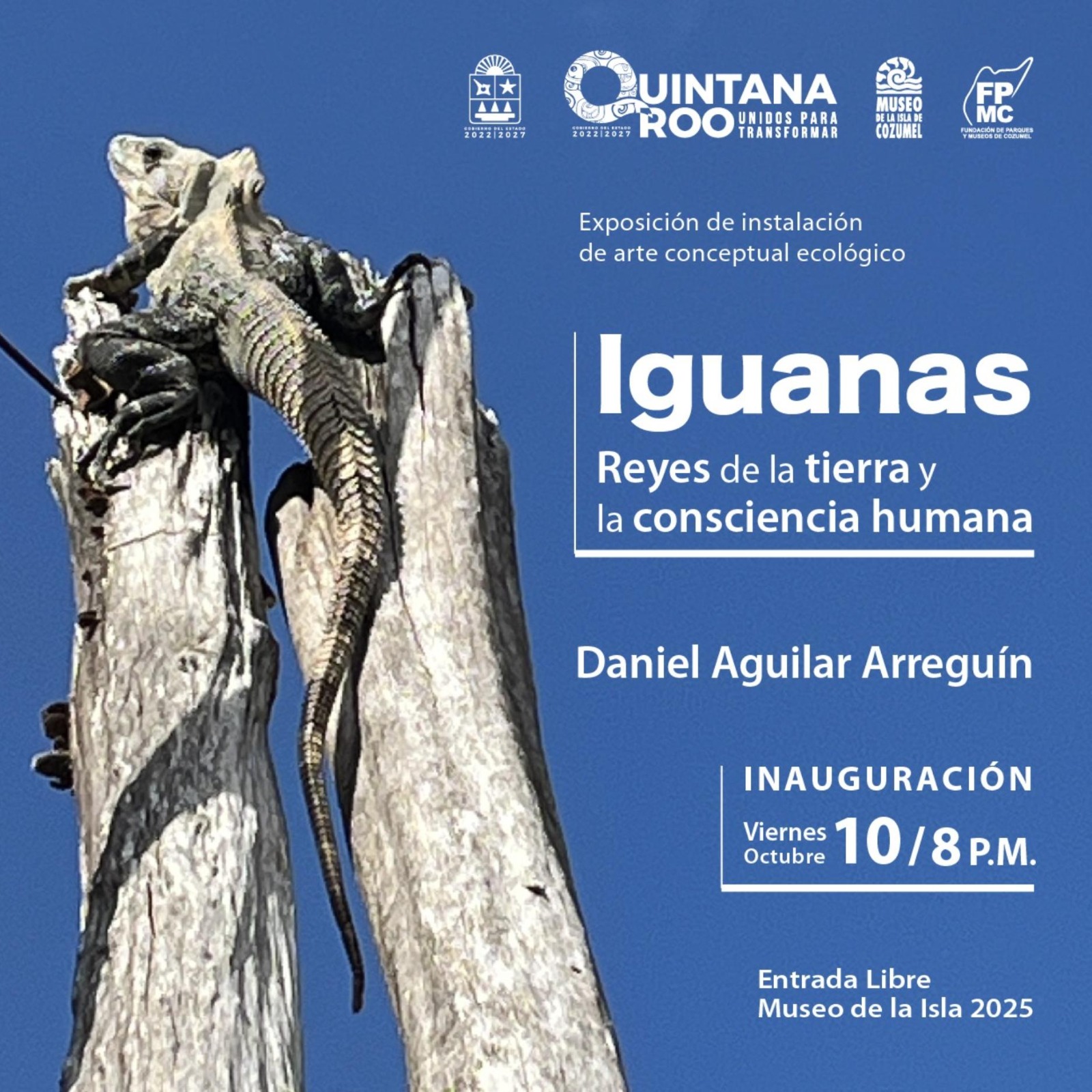 La Fundación de Parques y Museos de Cozumel (FPMC) presenta la instalación de arte conceptual “Iguanas: Reyes de la Tierra y la Consciencia Humana”, del artista Daniel Aguilar Arreguín, el 10 de octubre a las 20:00 horas en el Museo de la Isla. Esta experiencia busca fusionar creatividad, naturaleza y conciencia ecológica. Juanita Alonso Marrufo, directora general de la FPMC, enfatiza que estas actividades culturales fomentan la participación comunitaria, alineadas con el Nuevo Acuerdo por el Bienestar y Desarrollo de Quintana Roo. Isela Carrillo Cupul, directora del museo, menciona que Aguilar, originario de Ciudad de México, ha tenido una amplia trayectoria en diversas disciplinas artísticas y ha promovido la cultura en contextos nacionales e internacionales desde 1996. Su obra actual, “Iguanas: Reyes de la Tierra y la Consciencia Humana”, rinde homenaje a este reptil emblemático de la cosmovisión maya, considerado un símbolo de resiliencia y sabiduría ancestral, relacionado con Itzamná, deidad maya del conocimiento. La FPMC invita a la comunidad a participar en esta conexión entre naturaleza, espiritualidad y arte contemporáneo.
